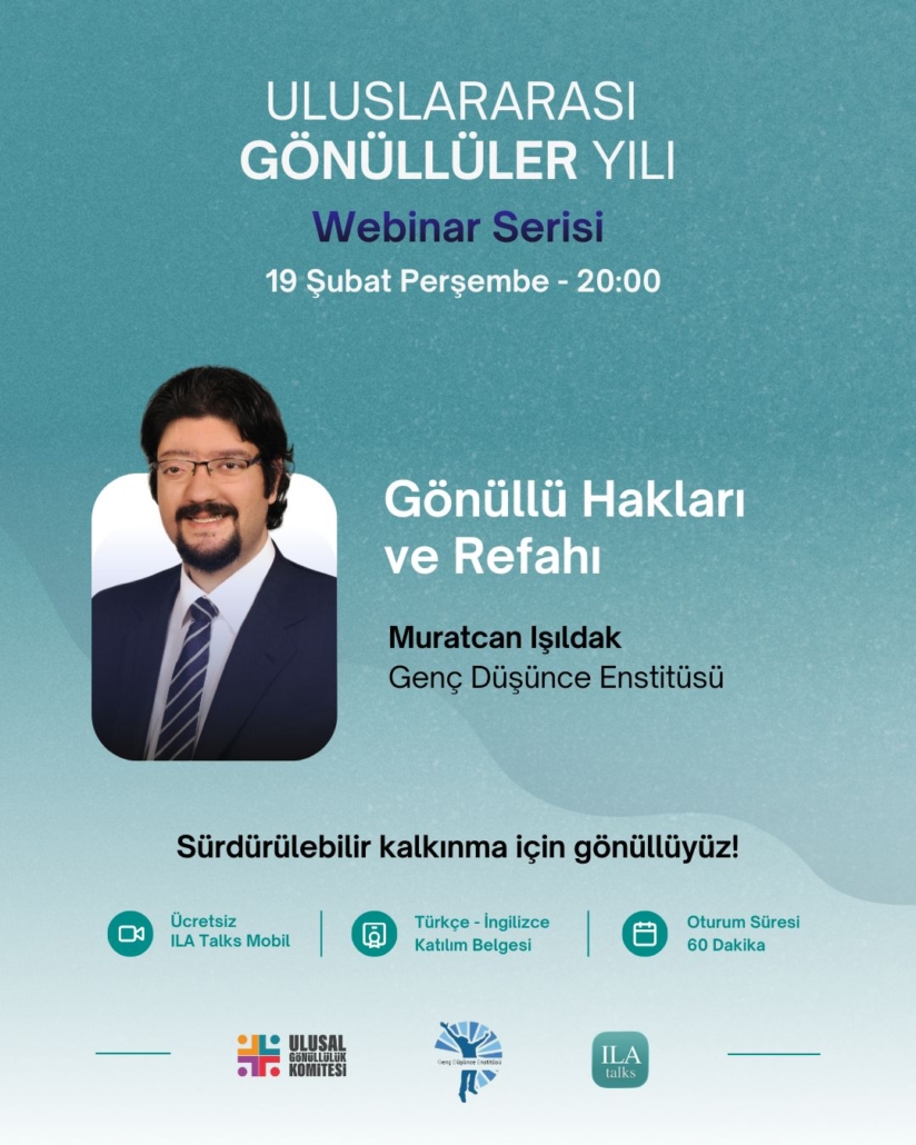 Genç Düşünce Enstitüsü Genel Başkani Muratcan Işıldak, gönüllülükte hak temelli yaklaşımın temel ilkelerini; bilgilendirilmiş onam, görev sınırları, sigorta, risk yönetimi ve güvenli çalışma ortamı başlıkları üzerinden ele alacak. Gönüllülerin desteklenmesi, takdir edilmesi ve güven duygusu içinde katkı sunmalarını sağlayan yapısal mekanizmalar paylaşacak.