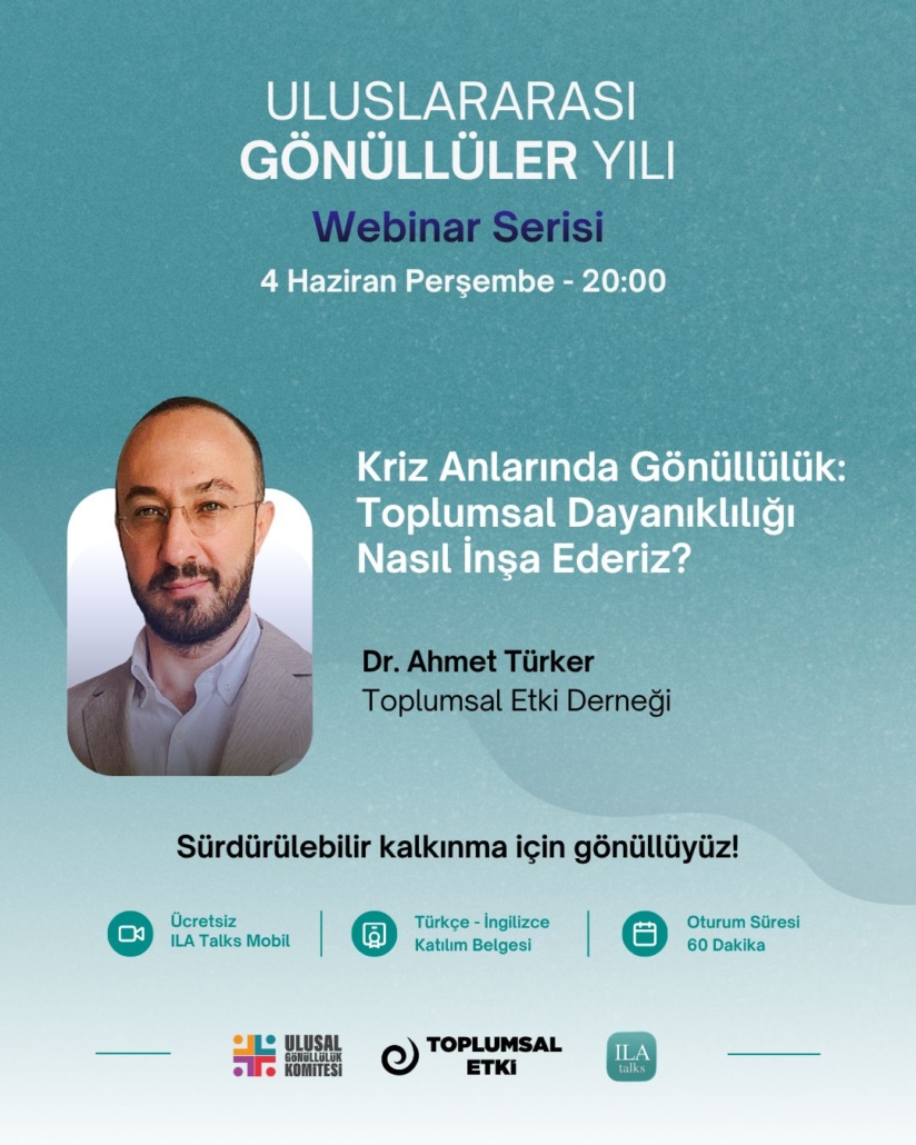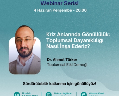 Toplumsal Etki Derneği Yönetim Kurulu Başkanı Ahmet Türker, kriz anlarında gönüllülüğün temel dinamiklerini; hızlı mobilizasyon, topluluk olarak hareket etme, iletişim ve ilişki yönetimi, motivasyon ve duygu yönetimi başlıkları üzerinden ele alacak.